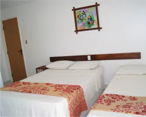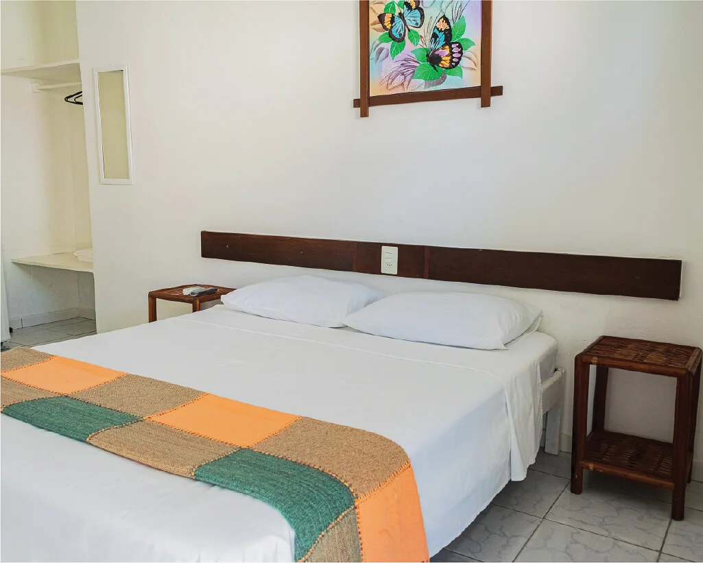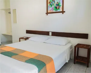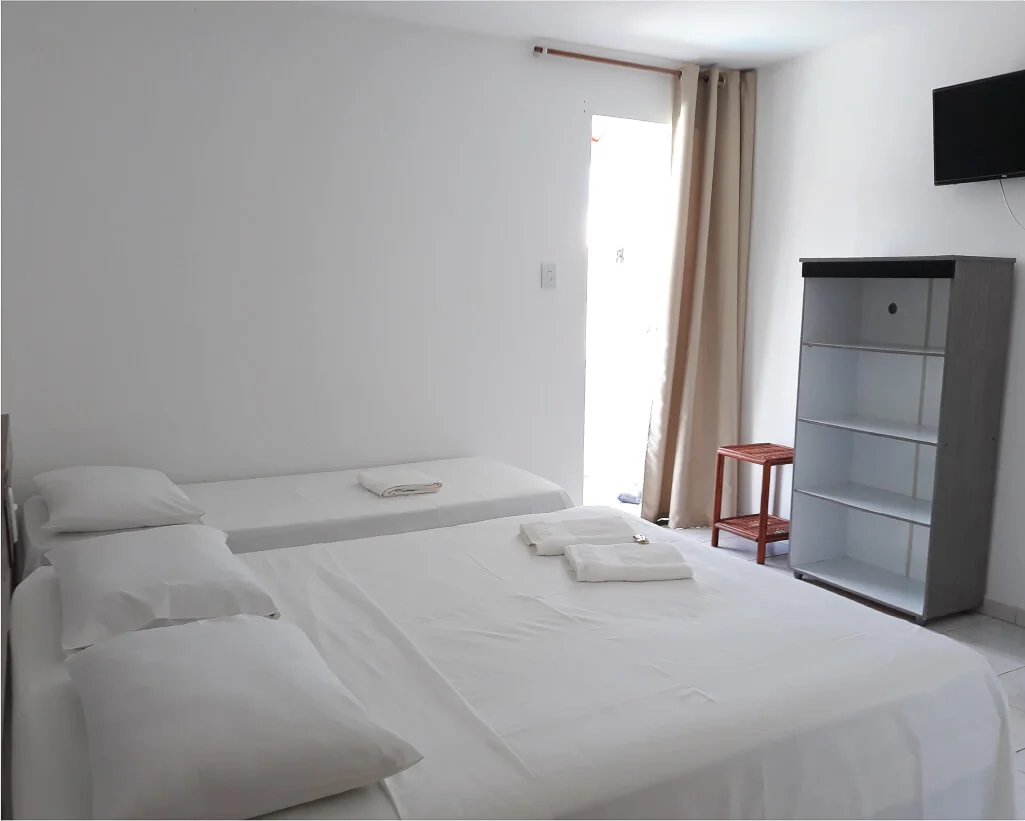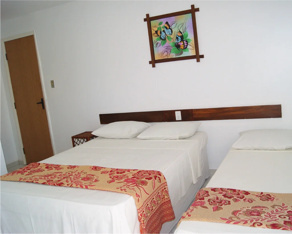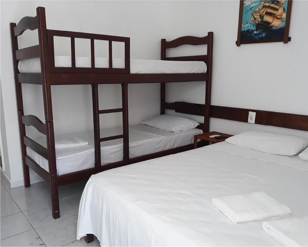 Cama casal, beliche ou camas de solteiro, mesa de cabeceira, armário, espelho, TV Smart, frigobar, ar-condicionado split e banheiro privativo. Varanda com vista lateral para a praia.